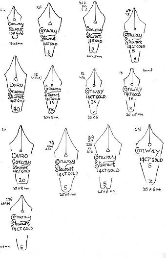 To the best of my knowledge all these nibs are different. The numbers in the left column refer to the nibs numbered in order from the top left to the bottom right. I have noted the pen numbers belonging to each nib in the second column, and the nib size in the third column from the left. This is not a comprehensive list since I prepared it before I had acquired many of the pens in my collection.